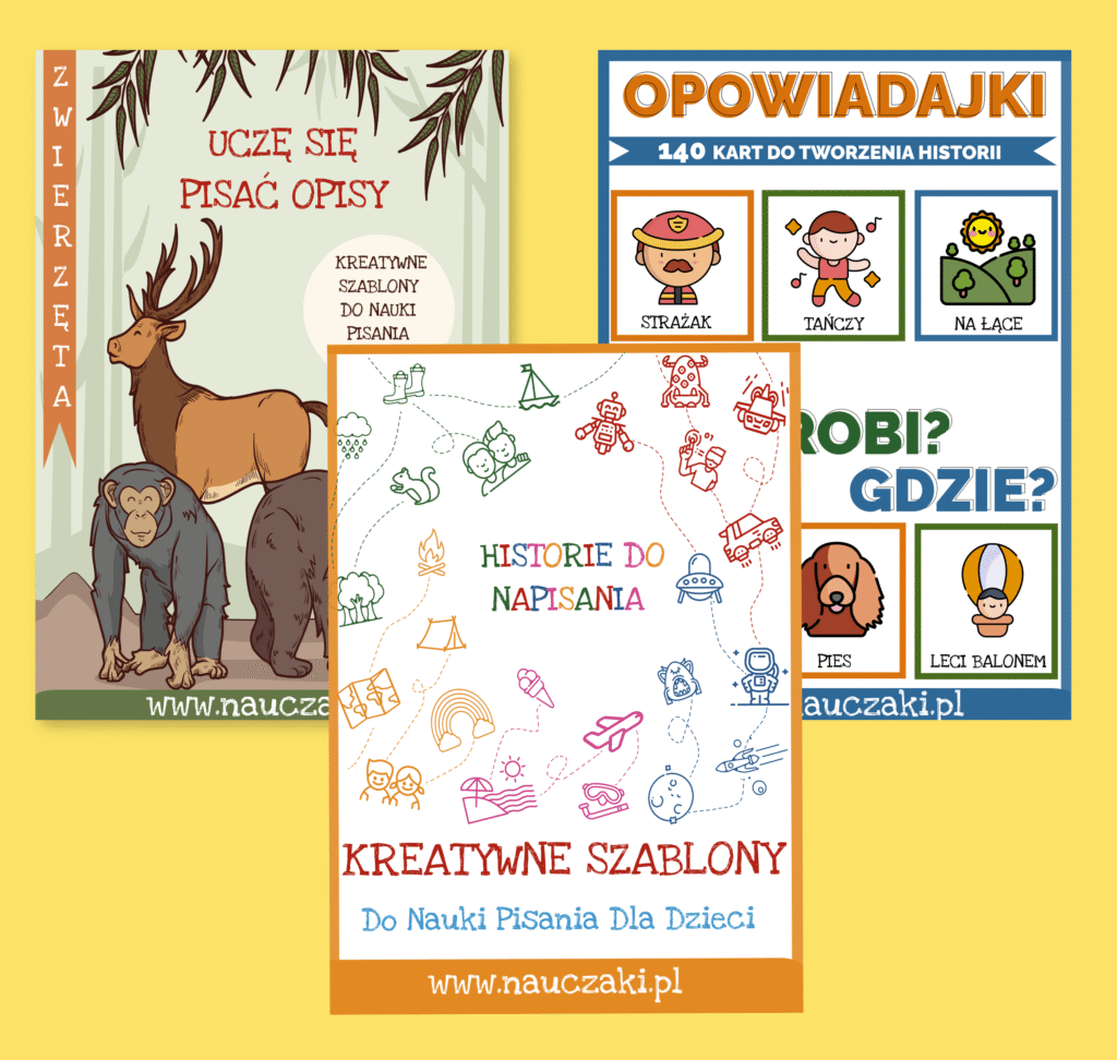 Ponad 200 stron gotowych scenariuszy (Historie do pisania + Opowiadajki + Uczę się pisać opisy), które wspierają Twoje dziecko na każdym etapie: