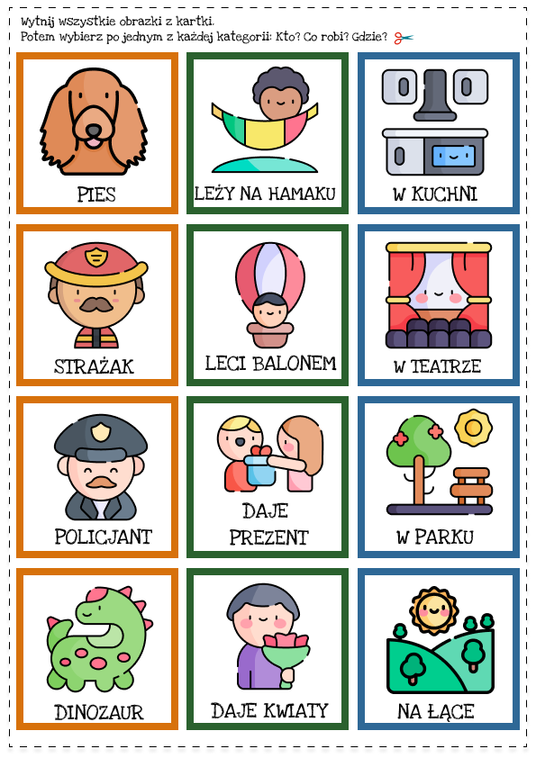 - Posegregujcie: Uporządkujcie obrazki do trzech osobnych kopert: KTO? / CO ROBI? / GDZIE?.