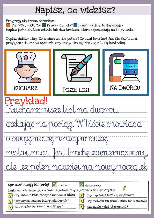 - PISANIE i SAMOOCENA: Dziecko pisze 1-5 zdań, rozwijając historię. Na koniec sprawdza Listę kontrolną – upewnia się, że praca jest poprawna i kompletna.
