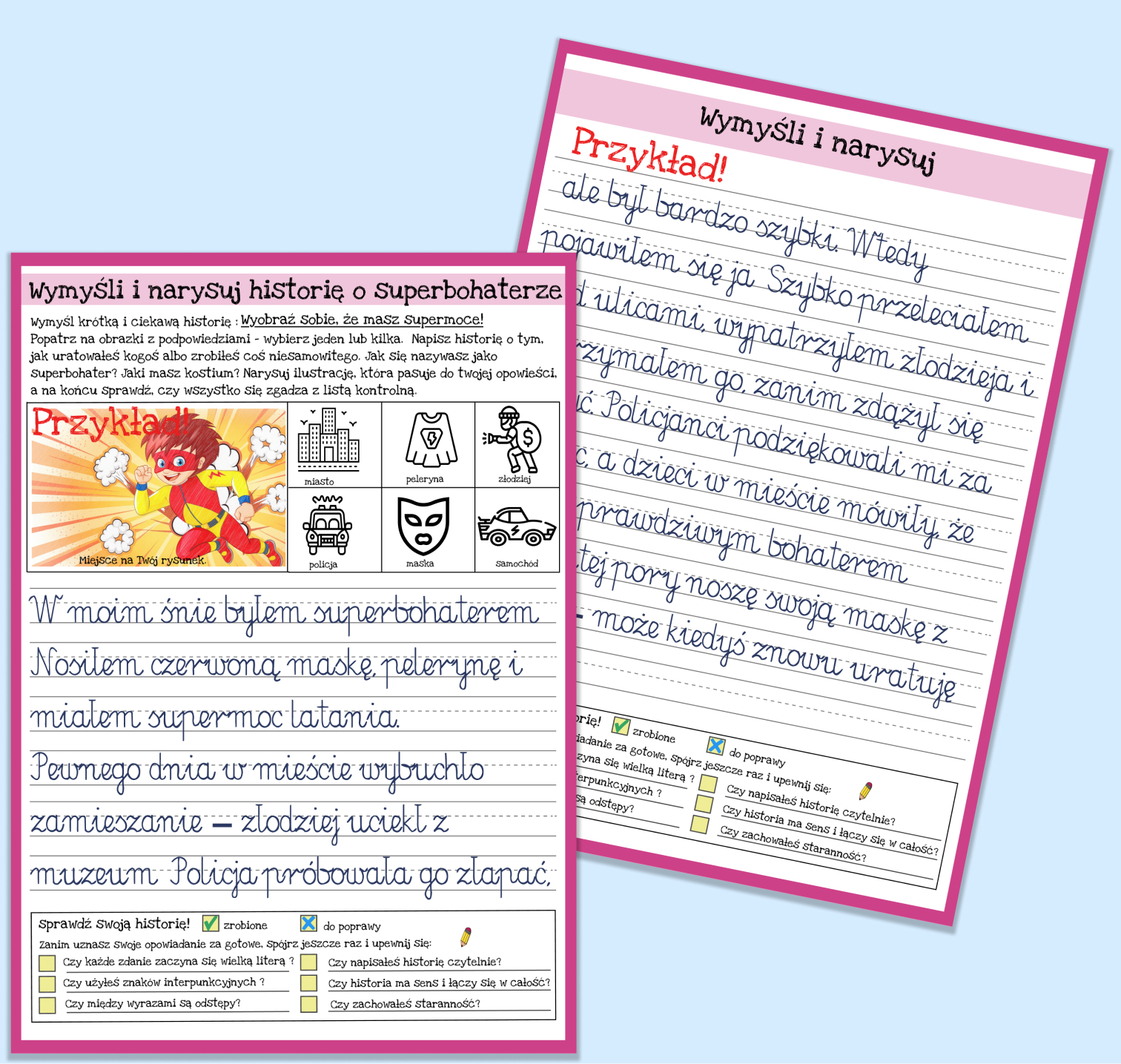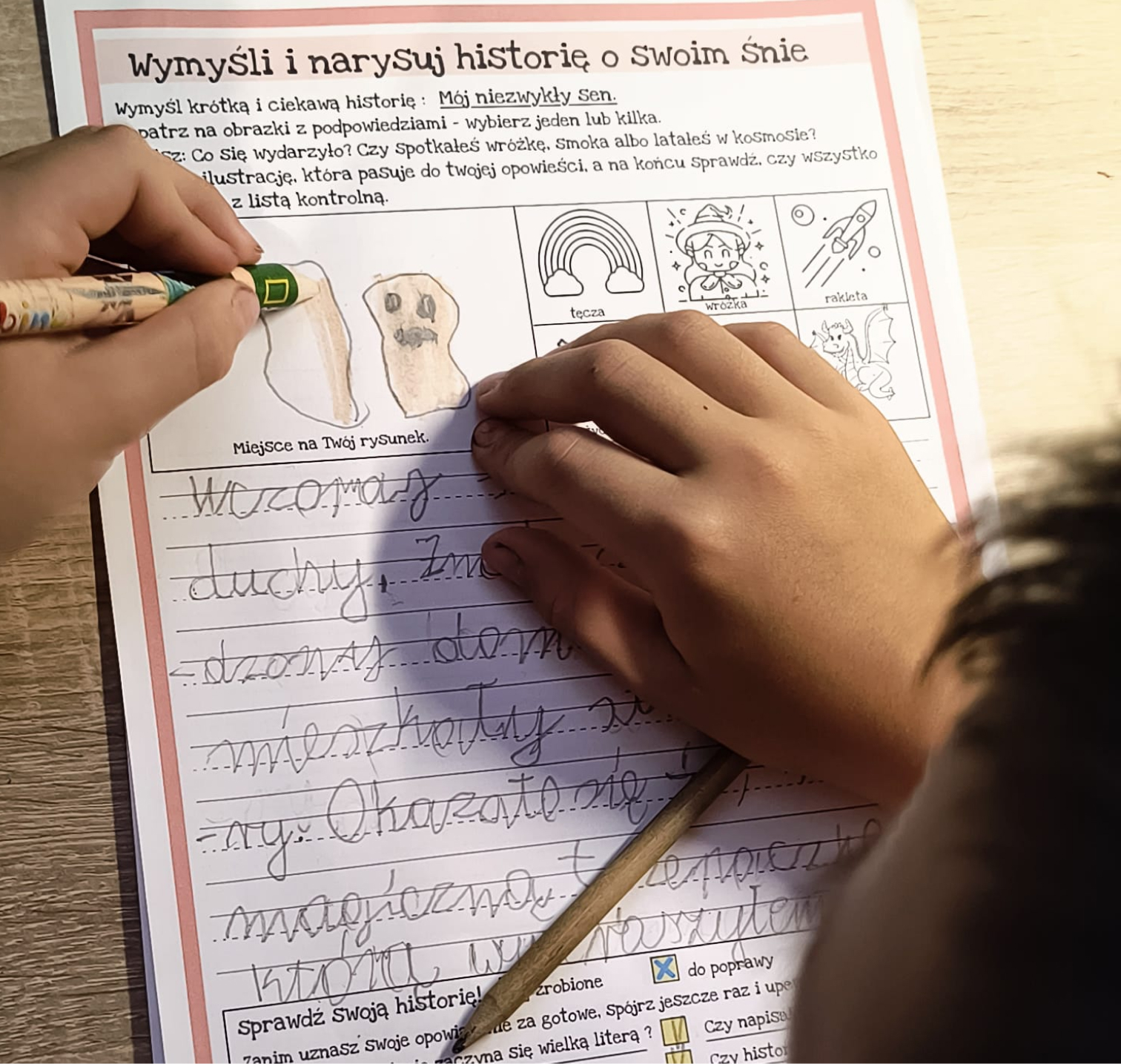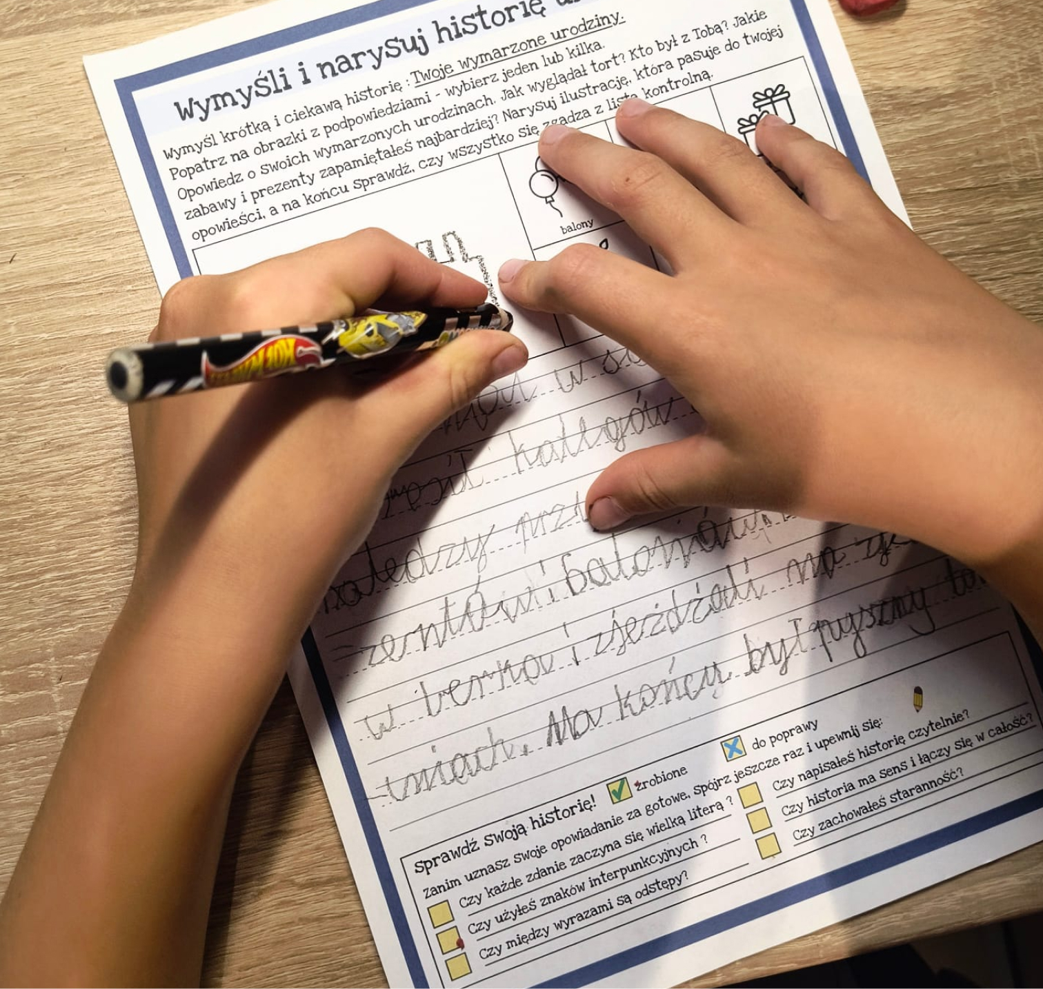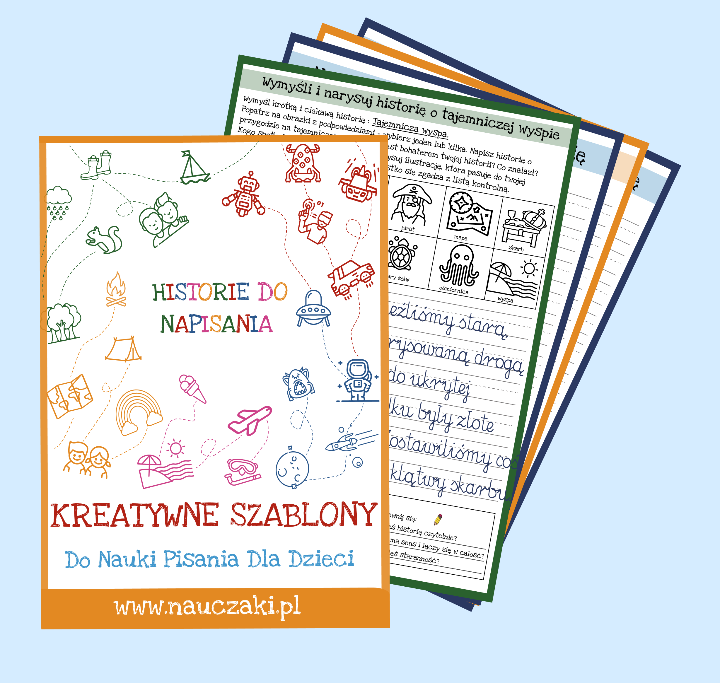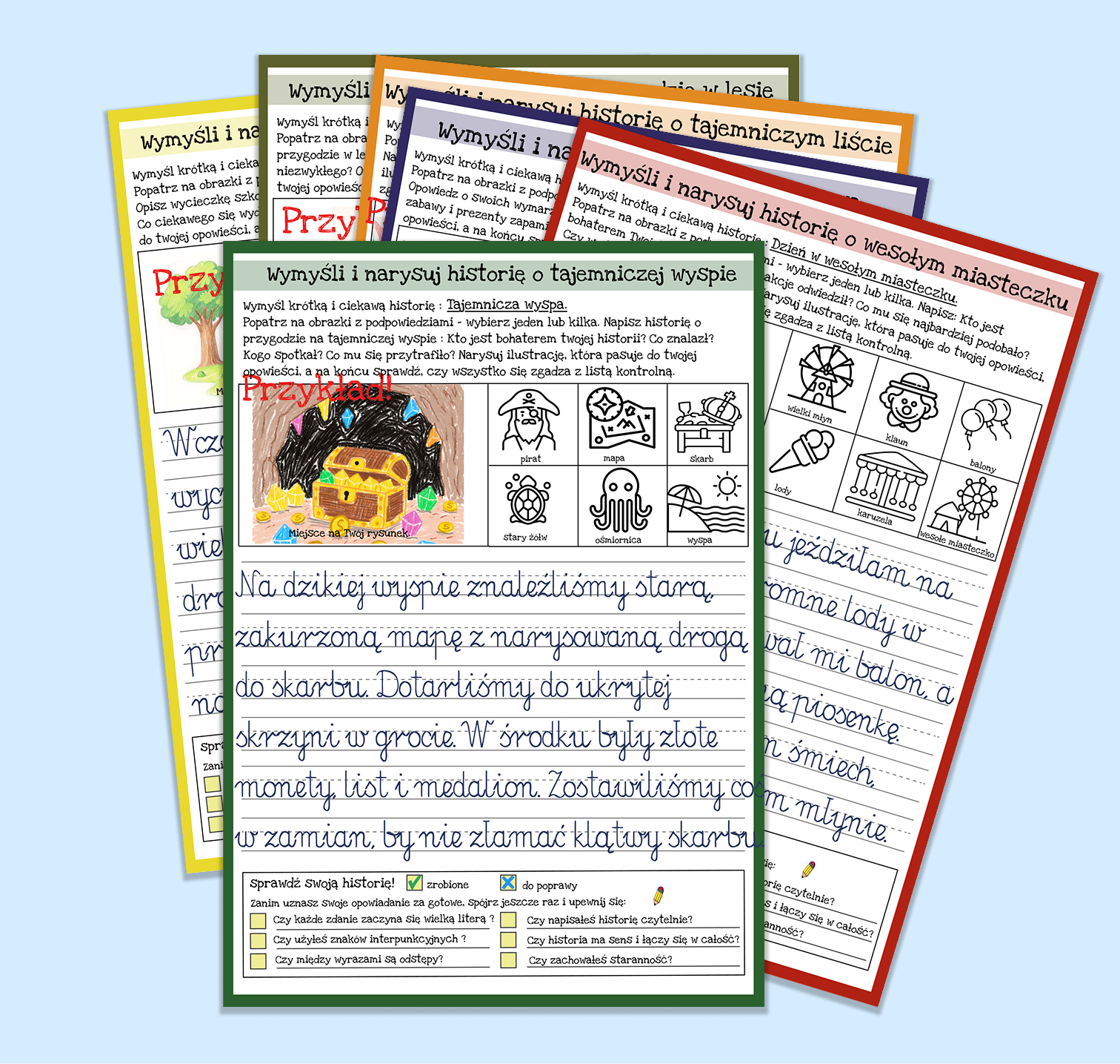 Zestaw to 92 strony w PDF gotowe do domowego wydruku, obejmujące 28 tematów przewodnich inspirujących do tworzenia historii (np. wakacje, kosmos). Zawiera checklistę dla dziecka, która uczy samodzielnego sprawdzania poprawności i logiki pracy, instrukcję dla dorosłych z praktycznymi wskazówkami oraz przykłady realizacji pokazujące, jak może wyglądać gotowa praca. Materiał idealny dla dzieci w wieku przedszkolnym i wczesnoszkolnym, rozpoczynających przygodę z pisaniem.