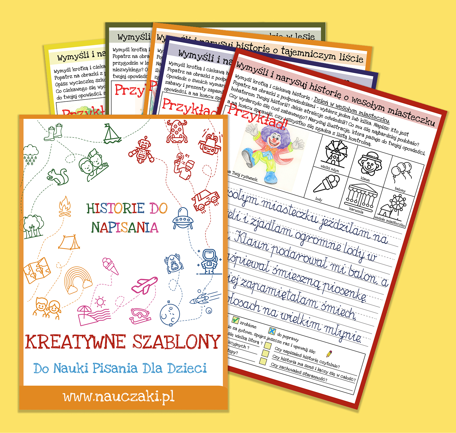 92 strony PDF / 28 tematów / Checklista dla dziecka / Instrukcja dla rodzica / Gotowe przykłady. Wszystko, czego potrzebuje dziecko, by zacząć pisać fascynujące historie!