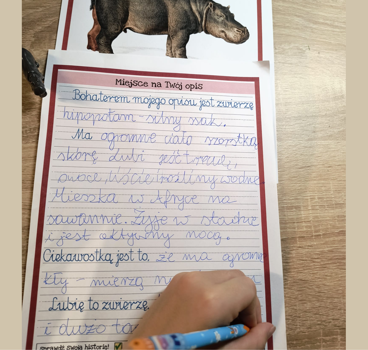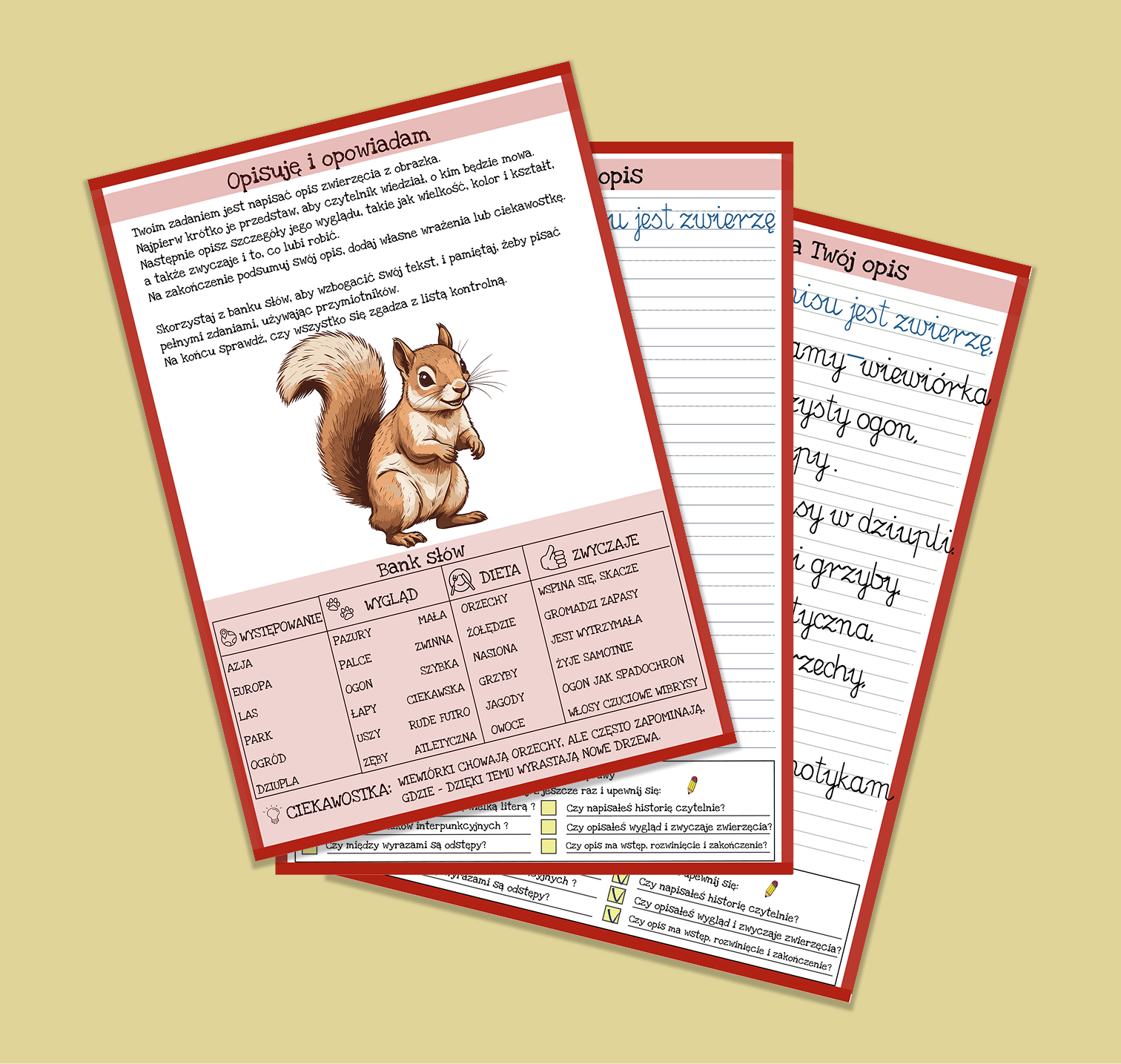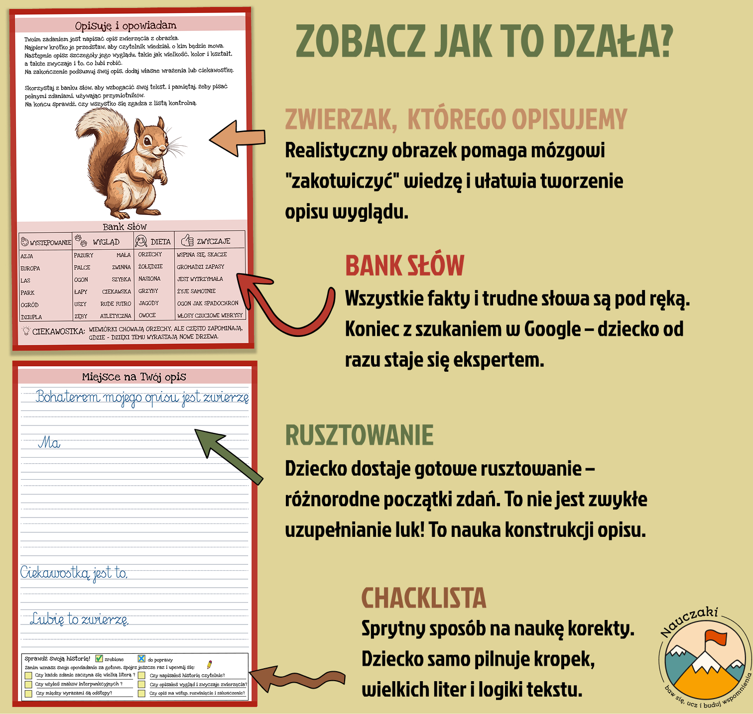 Zestaw prowadzi dziecko przez naukę pisania w naturalny i wspierający sposób – od rozmowy i pracy z bogatym bankiem słów, który pomaga poznać zachowania i zwyczaje zwierząt, przez pisanie krok po kroku, aż po samodzielne sprawdzenie efektów. Dzięki różnym poziomom trudności dziecko może uzupełniać zdania z podpowiedziami lub tworzyć cały opis samodzielnie, we własnym tempie. Checklista uczy samokontroli i spójności wypowiedzi, a praca bez ciągłego poprawiania wzmacnia pewność siebie i swobodę językową.