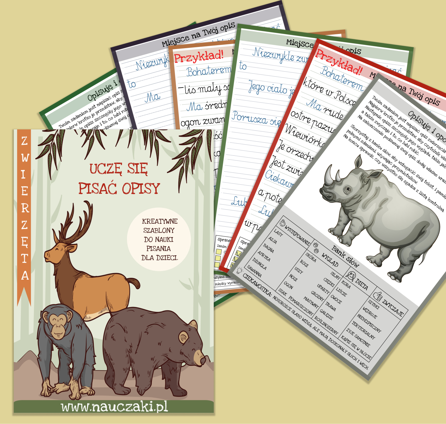 Zestaw składa się z 83 stron w formacie PDF, gotowych do wydruku. Obejmuje 20 zwierząt, dla których przygotowano po dwa poziomy trudności, a także banki słów, ciekawostki, przykłady oraz checklisty wspierające naukę samokontroli i poprawności językowej.