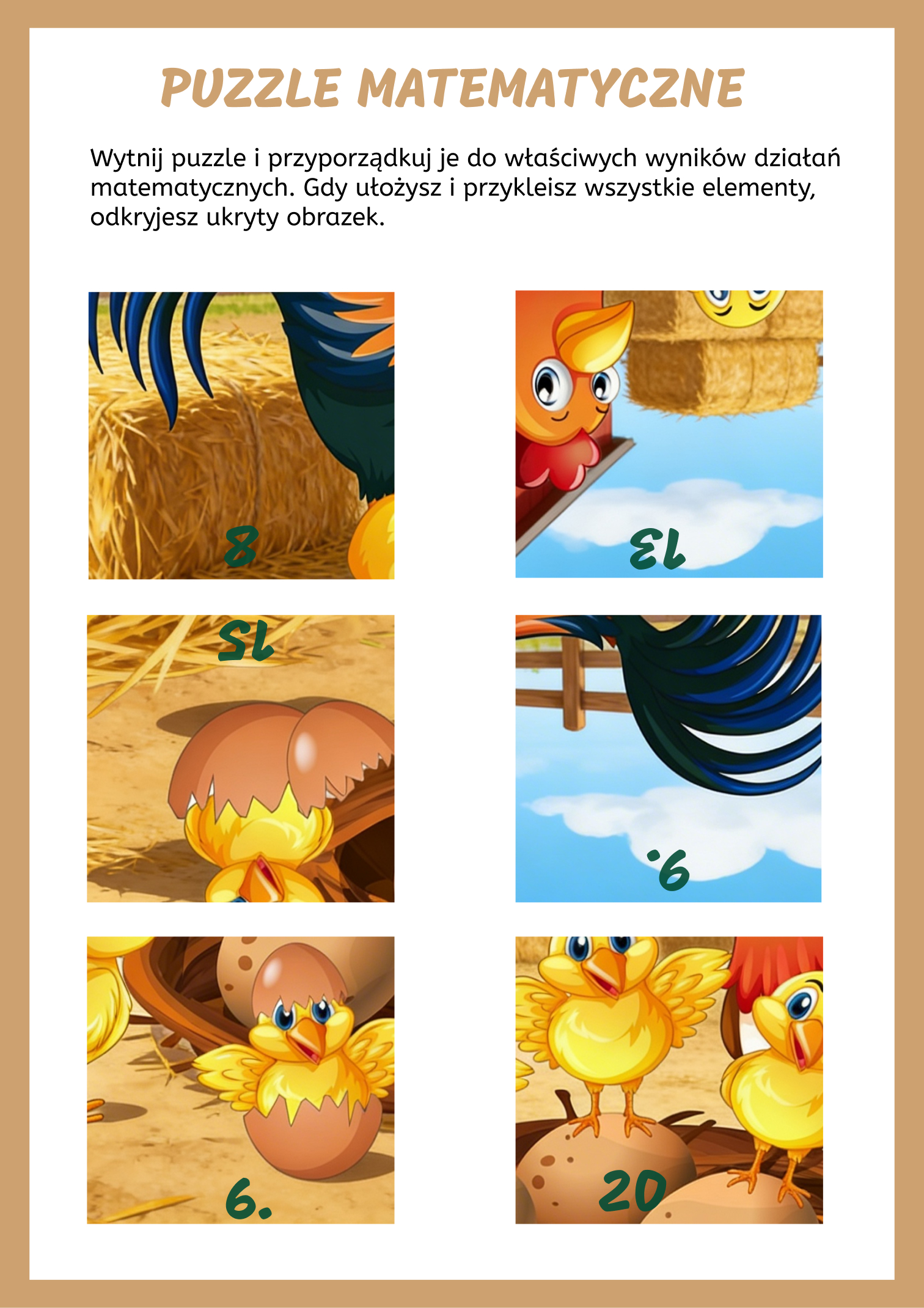 Zestaw „Wiosenne puzzle matematyczne” to 16 gotowych szablonów, które łączą naukę liczenia z kreatywną zabawą. Dziecko rozwiązuje działania, korzystając z pomocniczych kratek (dodawanie i odejmowanie zakres 1–20), a następnie wycina puzzle i dopasowuje je do wyników, odkrywając ukryty zimowy obrazek.
